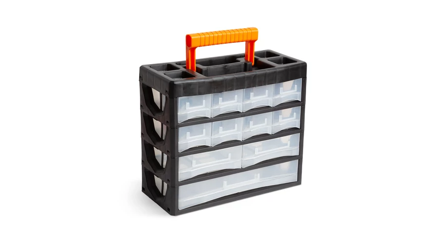 Hatékony munkát csak rendezett körülmények között végezhet! A munka során szükséges apró alkatrészeket, csavarokat, tiplit, szeget, kapcsolókat vagy egyéb elektronikai alkatrészeket, méret és típus szerint elkülönítve tarthat, ennek a hordozható rendszerezőnek a segítségével. Az elválasztóelemeknek köszönhetően, akár 24 féle kelléket is elkülöníthet egymástól. Az áttetsző és kivehető fiókok jó áttekinthetőséget biztosítanak.