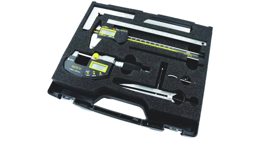 Digitális tolómérő 150 mm Digitális mikrométer 0+25 mm Derékszög 100x70 mm Rugós körző 100 mm Hajlékony méretskálás rozsdamentes acélvonalzó 200 mm Rajztű 150 mm