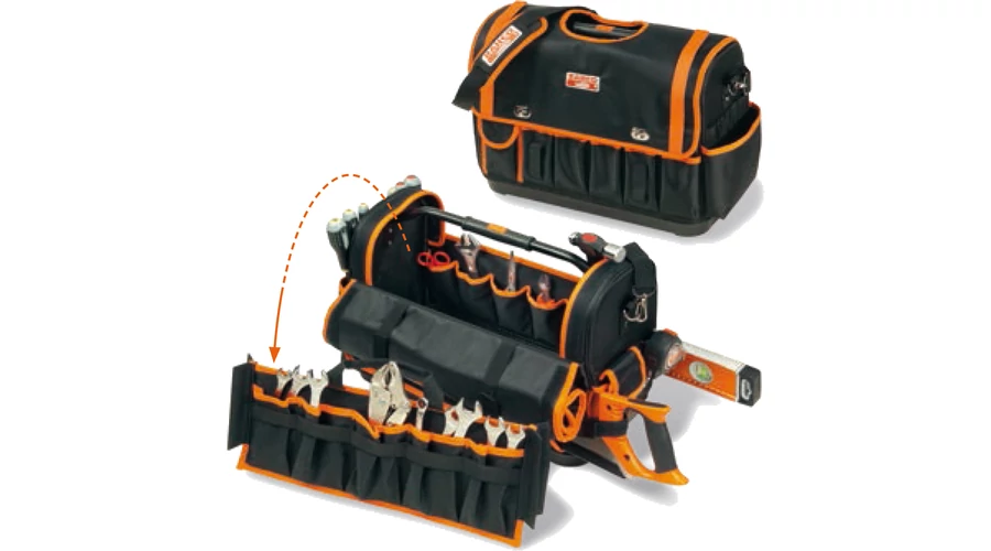 Nyitott szerszámtáska,üres Számtalan zseb, tartó, gumilap szolgál nagy mennyiségű szerszám elhelyezésére Kényelmes vállszíj Vízálló műanyag aljjal Méret: 470 x 230 x 355 mm Terhelhetőség: 25 kg Szállítás szerszámok nélkül